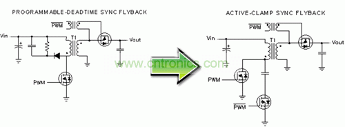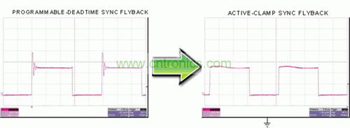 圖 4 描述了如何進(jìn)一步提高效率并利用同步 MOSFET 柵極驅(qū)動(dòng)信號(hào)來控制一個(gè)有源主緩沖器。這種結(jié)構(gòu)通常被稱為有源鉗位反向結(jié)構(gòu)。在前面示意圖中,我們已經(jīng)使用 RCD 緩沖器來降低一次側(cè) MOSFET 漏-源-電壓的電壓峰值。該電壓峰值出現(xiàn)在一次側(cè) MOSFET 關(guān)閉時(shí),這主要是由于變壓器主繞組的泄露能量造成的。RCD 緩沖器消耗了其緩沖器電阻中的這種能量。在有源鉗位反向結(jié)構(gòu)中,泄露能量由鉗位電容捕獲,并被帶至負(fù)載再循環(huán),最后返回到輸入。這就構(gòu)成了一個(gè)實(shí)際上無損耗的緩沖器。RCD 緩沖器的漏-源極-電壓波形和一個(gè)有源鉗位的對(duì)比關(guān)系如圖 5 所示。該有源鉗位消除了高頻峰值。除消除漏能損耗以外,開關(guān)損耗和 EMI 也得到了極大降低。在許多情況下,這種有源鉗位緩沖器允許使用低漏-源-電壓額定值的一次側(cè) MOSFET,從而進(jìn)一步降低了損耗,并有可能降低 MOSFET 的成本。