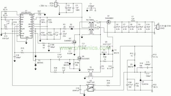 在自驅(qū)動(dòng)同步反向電源中,輸出二極管被一個(gè) N 通道 MOSFET 代替,同時(shí)必須向電源變壓器添加一個(gè)繞組以生成同步柵極驅(qū)動(dòng)信號(hào)。相比輸出二極管整流器,該同步MOSFET的低導(dǎo)通電阻可帶來更低的傳導(dǎo)損耗,這就極大地提高了高負(fù)載電流時(shí)的效率。