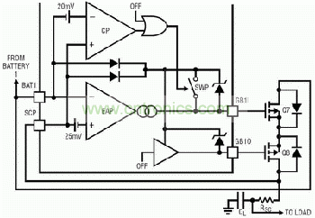 每條電源通路都由兩個背對背的PFET組成,這兩個PFET與短路檢測電阻RSC串聯(lián)。電池電源通路(PowerPathTM)開關(guān)驅(qū)動器等效電路如圖 5 所示。