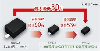 此次,產(chǎn)品陣容中新增了更加小型的VML2封裝(1.0×0.6mm)。通過這些產(chǎn)品,將非常有助于便攜設(shè)備節(jié)省空間。