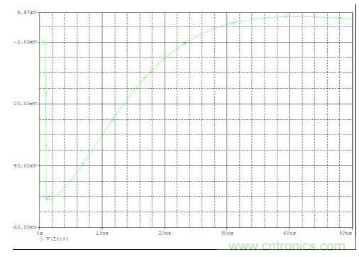 下面是一個如何使用上述關系的示例。問題是根據200kHz開關電源10 amp變化幅度允許范圍內的50mV輸出變化挑選一個輸出電容。所允許的峰值輸 出阻抗為:Zout=50 mV / 10 amps 或5毫歐。這就是最大允許輸出電容ESR。接下來就是建立所需的電容。幸運的是,ESR和電容均為正交型,可單獨處理。一 個高 (Aggressive) 電源控制環路帶寬可以是開關頻率的1/6或30kHz。于是在 30 kHz 時輸出濾波電容就需要一個不到5毫歐的電抗,或高于1000uF的電容。 圖2顯示了在5毫歐ESR、1000uF電容以及30 kHz電壓模式控制條件時這一問題的負載瞬態仿真。就校驗這一方法是否有效的10amp負載變動幅度而言, 輸出電壓變化大約為52mV。