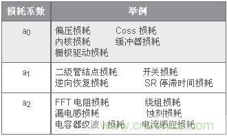 表1概括總結了各種電源損耗項及其相關損耗系數,該表提供了一些最佳化電源效率方面的折中方法。例如,功率MOSFET導通電阻的選擇會影響其柵極驅動要求及Coss損耗和潛在的緩沖器損耗。低導通電阻意味著,柵極驅動、Coss 和緩沖器損耗逆向增加。因此,您可通過選擇MOSFET來控制a0和a2。