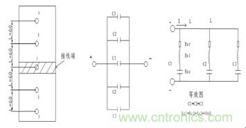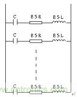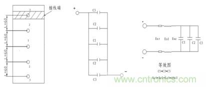 由圖6可知,同樣的器件,但是連接不同,其等效電路圖也不一樣。其條件同原有方案一樣,但其等效感抗不一樣。有等效電路圖可知,XL1=XL2=XL3=2πfL,而Esr和Esc三者數值相等,因此流經每個電容的電流I=U/R=40A。這樣能使電流均勻地分布到每個電容上。這樣,就解決了電流分布不均而使電容部分電容發熱嚴重的問題。