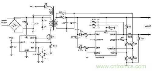 NCP4354是專為與NCP1246配合使用而設計的一款低待機能耗次級端恒流恒壓 (CCCV) 控制器,帶有LED驅動器 (圖3)。其價值在于,可檢測空載條件并使主控制器進入超低頻率跳周期模式,以降低待機功耗;只有一個反饋和關閉(OFF)控制所需的光耦;提高了空載效率(小于15 mW);元件更少。此外,它還具有CCCV反饋和LED驅動器、供電電壓高達36 V、在關機模式可調整最低Vout、1.25 V參考精度為1%,以及Icc大于100 μA等特性。NCP4354與NCP1246一起使用,可調節Vmin,市場及應用范圍包括筆記本電腦適配器及其他外部電源適配器。NCP435x系列還有一款不帶LED驅動器的產品NCP4353,可以與NCP1246一起使用來調節Vmin(僅B版本)。