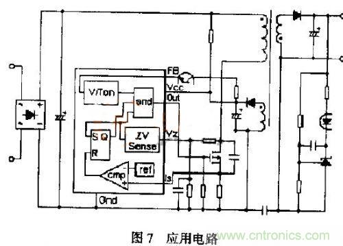 由(9),(10)或可知,調(diào)節(jié)輸出功率、穩(wěn)定輸出電壓可以調(diào)節(jié)導(dǎo)通時間或占空比或調(diào)頻方式或幾種方式綜合應(yīng)用。當(dāng)輸出功率下降或電源電壓上升,導(dǎo)通時間減小,反之導(dǎo)通時間增加;隨輸出功率的增加或減小變壓器初次級電流峰值均增加或減小,由式(3)可知變壓器的釋放儲能時間也隨之增加或減少,為實現(xiàn)“零電壓”開關(guān),變壓器不能工作在間歇狀態(tài),因此F%IM控制方式不能滿足本文電路的“零電壓”開通的要求。基于上述工作條件的約束,本文電路應(yīng)采用輸出電壓反饋控制導(dǎo)通時間,用“零電壓”檢測控制開關(guān)管導(dǎo)通時刻,即調(diào)頻、調(diào)占空比工作方式。具體電路可以采用通用器件組合,如圖7。