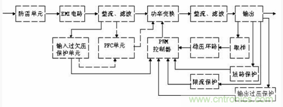 開關電源的主要電路是由輸入電磁干擾濾波器(EMI)、整流濾波電路、功率變換電路、PWM 控制器電路、輸出整流濾波電路組成。輔助電路有輸入過欠壓保護電路、輸出過欠壓保護電路、輸出過流保護電路、輸出短路保護電路等。