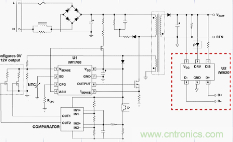 圖8 為基于Dialog 公司2014年初推出的iw620+iw1760的快速充電設計方案實物圖,電路的設計思路為iW620快速充電接口IC可以通過USB數據線檢測到支持Quick Charge 2.0的移動設備發出的指令,然后與iW1760 PWM原邊控制器進行通信,對電源適配器輸出電壓進行配置。位于初級側的iW1760就可提供電流感應。通過其可編程的主動快速放電專利技術能將輸出電壓從9V或12V降至5V, 因此,當用 戶拔掉連接Quick Charge 2.0手機的USB數據線,再將其連接至非Quick Charge 2.0手機時,iW620可以迅速把輸出電壓降至5V,避免對其造成損壞。