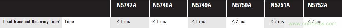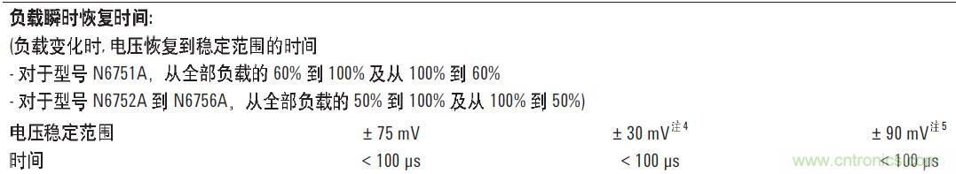 直流電源的瞬態(tài)響應(yīng)時(shí)間快慢和跌落的幅度不盡相同。例如,安捷倫N6705B直流電源分析儀中所用的高性能模塊N675xA, 瞬態(tài)響應(yīng)指標(biāo)如下: