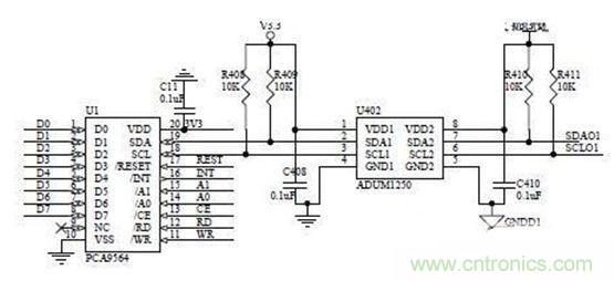OZ89采樣模塊將采集處理后的數(shù)據(jù)通過(guò)I2C總線發(fā)送到LF2407,由于LF2407自身不帶I2C 接口,本設(shè)計(jì)利用PCA9564擴(kuò)展其I2C接口。為了防止電磁干擾影響I2C總線上數(shù)據(jù)的傳輸,必須對(duì)總線信號(hào)進(jìn)行隔離,考慮到I2C 總線是雙向傳輸?shù)模褂肁DuM1250雙向隔離芯片進(jìn)行隔離。PCA9564及雙向隔離電路如圖2所示。