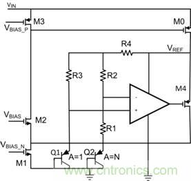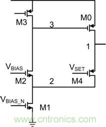 因此,輸出電壓對溫度和工藝變化極為敏感。要避免這種問題,就必須創(chuàng)建一個更為理想的跟隨器,其中 M4 是反饋環(huán)路的一部分(圖3)。