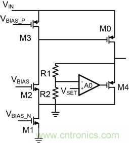 圖3:M4位于放大器反饋環(huán)路中、無輸出電容器的LDO。