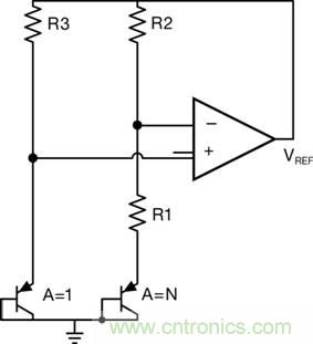 電阻器R1與R2之比可定義公式5中正溫度系數(shù)項的增益。為了讓該增益系數(shù)準(zhǔn)確,我們使用較大面積單位電阻器。使用特殊的電阻器布局,可實現(xiàn)0.1%的誤差比例精度。