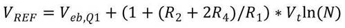 通過添加雙極性晶體管的負(fù)溫度系數(shù)基射極間電壓,可獲得帶隙電壓的低溫系數(shù),從而可通過在不同電流密度下偏置的兩個基射極間電壓之差獲得正溫度系數(shù)電壓。為電阻器R2和R3選擇相等的值,參考電壓就可表示為公式5: