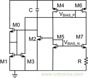 偏置發(fā)生器通常不需要特別啟動電路,這可減少靜態(tài)電流和占用面積。如果電流足夠小,電阻R 就可以忽略。由M5/M7和M4/M6構(gòu)成的兩個電流鏡可互連成一個閉環(huán)。