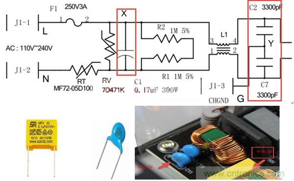 如圖X電容,Y電容。根據(jù)IEC 60384-14,安規(guī)電容器分為X電容及Y電容:1. X電容是指跨與L-N之間的電容器, 2. Y電容是指跨與L-G/N-G之間的電容器。