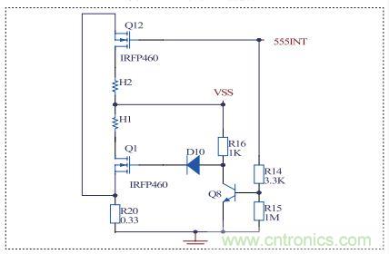 主要把NE555D產生的一個36.7KHZ的脈沖功率放大,經發(fā)射線圈發(fā)射出去。當脈沖為高電平時,Q12柵極為高電平,Q12導通,此時Q8飽和,Uceq電壓只有0.67V,經D10-4148后Q1柵極電壓為0,Q1截止。當脈沖為低電平時,Q8、Q12同時截止,電流直接由R16 D10 Q1,Q1導通。整個過程中Q1與Q12均以一開一關的形式工作。電路如圖2: