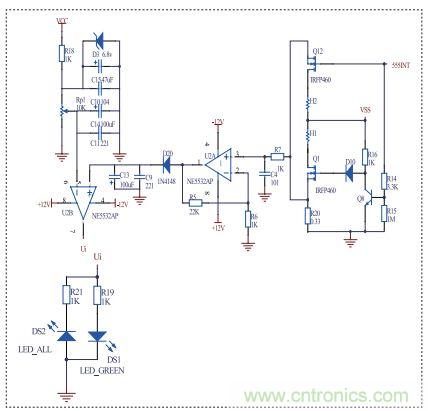 當有感應負載時,R20(0.33歐)電阻上的電壓會增大,經運放U2A放大A=1+R5/R6=23倍后,電壓變化明顯,再經過1N4148整流濾波,得電壓U1與基準源Uo比較,此時U1>Uo,運放輸出Ui為高電平,七彩燈閃爍;當感應負載充滿電(或沒有感應到負載),此時U1<Uo,運放輸出Ui為低電平,綠燈亮。