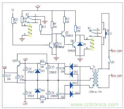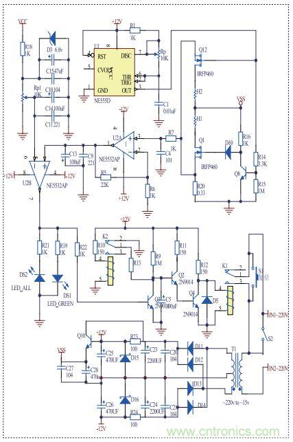斷電后,繼電器K2閉合,此時C5與R13構成RC放電電路,給C5快速放電。當按一下輕觸復位開關時,充電器重新啟動。當感應負載充滿電(或無感應負載)時,電容C5充電,其電壓為Ut 由公式Ut=12*(1-e-t/R9C5)得:t=-R9C5ln(1-Ut/12) 其中C5=100UF,R9=1MΩ,Ut=1.34V, 經計算得斷電時間:t=10S 實現(xiàn)了10秒自動斷電。在綠燈亮的10秒內只要有感應負載,則Ui為高電平,Q3飽和,電容C5放電。整個充電過程實現(xiàn)智能化斷電。