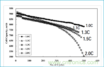 這是關于鋰離子電池充放電速率與其容量和循環(huán)壽命的關系圖,縱軸代表容量,橫軸代表循環(huán)壽命,由不同的點所描繪出來的曲線代表了用不同的速率對電池進行充放電時容量與循環(huán)壽命之間的關系。其中的C是與電池的容量有關的充放電速率數據,假設某個電池的容量為1000mAH,如果用1000mA的電流對它進行充電或放電,則充滿或放完其全部電能的時間是一個小時,這時候的C就代表1000mA,2C則代表2000mA。根據這些定義,這個圖告訴我們如下信息:這個電池的初始容量為900mAH,假如用1C即900mA的電流對它進行充放電,經過500個循環(huán)后,其容量還剩下大約780mAH;如果用2C即1800mA的電流對它進行充放電,則經過500個循環(huán)后,其容量會下降到大約500mAH。