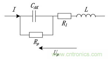 根據鋁電解電容的物理結構,可以用圖 1中所示的電路等效,其中CAK代表兩電極間的理想電容量;Rp 是并聯電阻,代表了電容的漏電流成分;Rl 代表了電容引出端及電極部分的串聯電阻成分;L 代表了引出線和連接處的等效串聯電感成分。