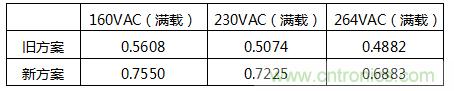 以下所有表中舊方案為采用電解電容的產品,新方案為采用填谷電路無電解電容的新產品