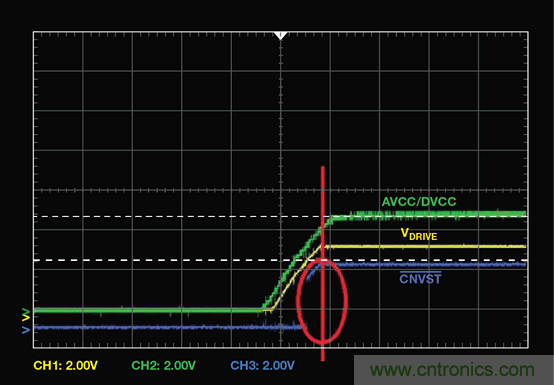 在所有電源均完全建立之前,不得切換數字引腳。對于SAR ADC,轉換開始引腳CNVST 可能對噪聲敏感。在圖1 所示示例中,當AVCC、DVCC 和VDRIVE 仍在上升時,主機cPLD 拉高CNVST。這可能使 AD7367 進入未知狀態,因此,在電源完全建立之前,主機應使 CNVST 保持低電平。