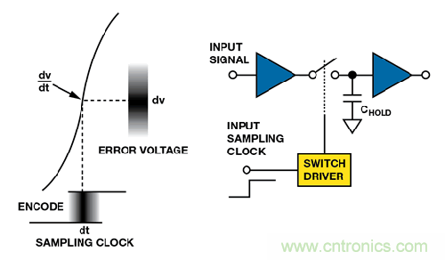 孔徑或采樣時鐘抖動設定SNR 限值,尤其是對高頻輸入信號。系統抖動有兩個來源:來自片內采樣保持電路的孔徑抖動(內部抖動),以及采樣時鐘上的抖動(外部抖動)。孔徑抖動為轉換間的 采樣時間變化,為ADC 的函數。采樣時鐘抖動通常為主要誤差源,但兩個源都會導致模擬輸入采樣時間變化,如圖9所示。它們的影響難以區分。