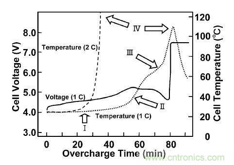 下圖是鋰離子電池過充電測(cè)試的一個(gè)事例。可以看出充電過程中鋰離子電池芯內(nèi)部溫度和電壓的變化情況,正常1C充電時(shí),電池芯的溫度隨恒流充電慢慢升高,而隨恒壓階段電流減小慢慢降低,整個(gè)過程溫度可控,安全。當(dāng)大電流(2C或以上)時(shí),電池芯內(nèi)部反應(yīng)劇烈發(fā)生熱失控,溫度急劇升高而發(fā)生起火或爆炸。