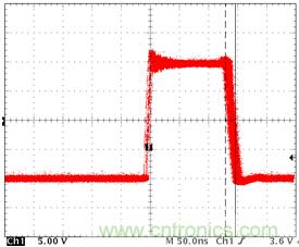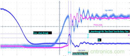 測(cè)試的目的是看上MOS管導(dǎo)通時(shí),有沒(méi)有同時(shí)把下管打開,從而導(dǎo)致電源直接導(dǎo)通到地而引起短路。如圖三所示藍(lán)色曲線(Vgs_Lmos)就是下管在上管導(dǎo)通的同時(shí),被帶了起來(lái),如果藍(lán)色曲線的被帶起來(lái)的尖峰超過(guò)了MOS管的Vth要求,同時(shí)持續(xù)時(shí)間(Duration)也超過(guò)了datasheet要求,從而就會(huì)有同時(shí)導(dǎo)通的風(fēng)險(xiǎn)。當(dāng)然,這是大家最常見(jiàn)到的情況。