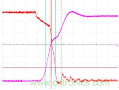 下面這種情況有非常多的人會(huì)忽視,甚至是一些比較有經(jīng)驗(yàn)的電源測(cè)試工程師。下面組圖四是下管打開,上管關(guān)閉時(shí)候的波形(圖4-1是示意圖,圖4-2示實(shí)際測(cè)試圖)。雖然沒(méi)有被同時(shí)帶起的情況,但是請(qǐng)注意上下管有交叉的現(xiàn)象,而且交叉點(diǎn)的電平遠(yuǎn)高于MOS管規(guī)定的Vth值,這是個(gè)嚴(yán)重的shoot through現(xiàn)象。最直接的后果就是MOS管燒毀!