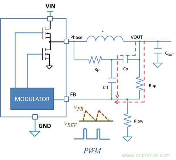 與傳統電壓模式或電流模式控制架構不同的是,DCAPx控制系統擁有兩條直接輸出反饋路徑:一條通過反饋電阻器分壓器網絡,另一條則通過直流電阻(DCR)注入電路,如圖2所示。DCAPx控制系統并無傳統II型或III型補償器那樣的大直流電(DC)流增益誤差放大器。在FB引腳處調制PWM脈沖。FB引腳通常是傳統控制架構的誤差放大器負輸入端。對于DCAP、DCAP2、DCAP3,它是PWM比較器的一個輸入端。