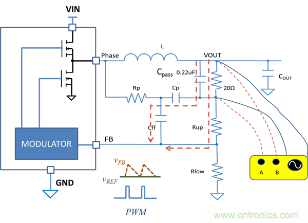 DCAP™或DCAP2™/DCAP3™調節器(在這次討論中,簡稱之為DCAPx)因其簡單性而流行。當涉及到控制環路增益的測量時,DCAPx給工程師帶來了挑戰。通過從反饋電阻器分壓器的頂部切斷環路(如圖1所示),很容易測量波特圖。這適合傳統控制架構,因為傳統架構只有一條輸出反饋路徑,且反饋在脈寬調制(PWM)之前經過補償器。