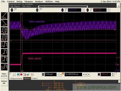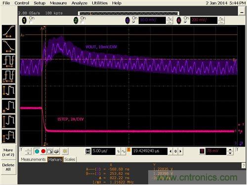 圖5展示了負載逐步升壓和逐步降壓時的相應瞬態響應。筆者還用PMP8824進行這些實驗。