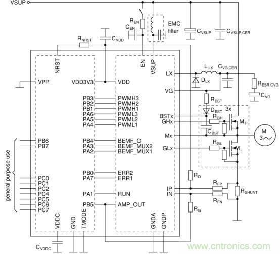完善的內部集成功能使得PCB板級的設計變得簡單,另外,其內置的BEMF測量模塊,使得用戶在測量相電壓時無需使用外部分壓電阻,進一步簡化板級的設計。