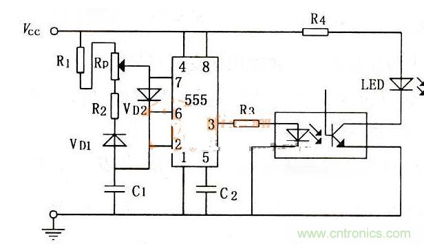 1、此電路可去掉VD1、VD2以及滑動變阻器Rp,這樣5定時器就會輸出占空比不變的脈沖波形。