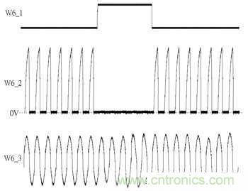 參考圖2其W6_3為線圈訊號(hào)、W6_2為S12即Q13之閘極端訊號(hào)、W6_1為Q131閘極端訊號(hào),當(dāng)RX-U1輸出高電位到Q131便會(huì)使該區(qū)段S12訊號(hào)維持在低電位,造成整流器在該區(qū)段不發(fā)生導(dǎo)通狀況,用意在于暫停整流動(dòng)作。