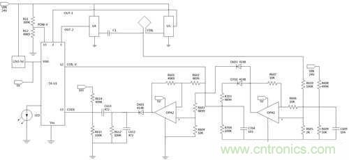 在圖4中由兩個(gè)運(yùn)算放大器OPA1、OPA2構(gòu)成兩個(gè)差動(dòng)放大電路,其OPA1動(dòng)作為由R608與R609進(jìn)行分壓驅(qū)動(dòng)電源作為差動(dòng)參考點(diǎn);另外,由R610與R605對(duì)線圈諧振訊號(hào)進(jìn)行分壓作為放大訊號(hào)輸入,在此有一配置為R608、R609與R610、R605之分壓比例皆為50比1,其用意在于取出與電源驅(qū)動(dòng)電壓與諧振訊號(hào)中開關(guān)電壓失真相等后,透過差動(dòng)放大出諧振訊號(hào)高于電源驅(qū)動(dòng)電之成分進(jìn)行放大。