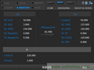 由于逆變器自身也會消耗電能,所以逆變器存在的一個天然屬性就是它無法將直流電能100%的完全轉換成交流。但是,轉換效率卻是我們判斷一個逆變器好壞的一個標準。在GB/T 20321標準中規定:在額定輸出狀態下,其輸出容量不大于2kVA的逆變器,效率應大于或等于80%;大于2kVA的逆變器,效率應大于或等于85%。如下圖,即對逆變器效率的實測。