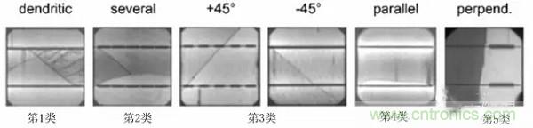 2011年,德國ISFH公布了他們的研究結果:根據(jù)電池片隱裂的形狀,可分為5類:樹狀裂紋、綜合型裂紋、斜裂紋、平行于主柵線、垂直于柵線和貫穿整個電池片的裂紋。