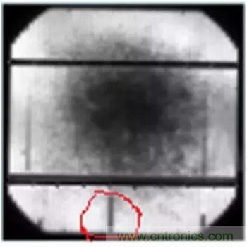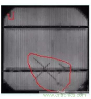 給晶硅組件施加電壓后,所激發(fā)出的電子和空穴復合的數(shù)量越多,其發(fā)射出的光子也就越多,所測得的EL圖像也就越亮;如果有的區(qū)域EL圖像比較暗,說明該處產生的電子和空穴數(shù)量較少(例如圖3中電池中部),代表該處存在缺陷(復合中心);如果有的區(qū)域完全是暗的,代表該處沒有發(fā)生電子和空穴的復合(圖3和圖4中紅線所標處),也或者是所發(fā)光被其它障礙所遮擋(圖3和圖4主柵線處),無法檢測到信號。