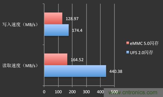 通過上面的測試,大家能夠看到,UFS 2.0閃存智能終端產品的讀取速度一般都能夠達到400MB/s以上,而寫入速度則在100MB/s以上。換句話說,大小為5MB左右的MP3歌曲,UFS 2.0閃存一秒即可寫入20首以上,夠不夠快呢?另外,這樣的速度究竟處于怎樣的水平?相比時下常見的eMMC 5.0閃存解決方案,優勢究竟有多少呢?我們還是用數據來說話。