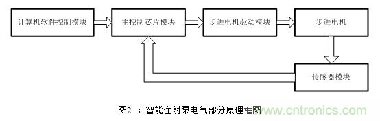 上圖1為最常見的單通道注射泵方案框圖,大體上可以分為軟件系統(tǒng)、機械系統(tǒng)和電氣系統(tǒng)。而詳細的劃分又可以將其劃分為:主控系統(tǒng)、電源系統(tǒng)、電機驅(qū)動系統(tǒng)、壓力檢測系統(tǒng)、自動報警系統(tǒng)。最基礎(chǔ)的工作原理為:控制部件通過控制步進電機來推動機械部件的操作,同時會有專門的傳感器模塊實時的檢測實際情況并反饋給控制部件。簡單講,注射泵的電氣部分的工作原理如下圖2: