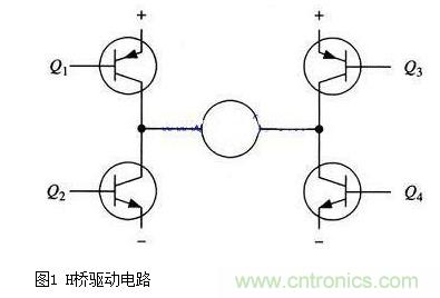圖1中所示為一個典型的直流電機控制電路。電路得名于“H橋驅動電路”是因為它的形狀酷似字母H。4個三極管組成H的4條垂直腿,而電機就是H中的橫杠(注意:圖1及隨后的兩個圖都只是示意圖,而不是完整的電路圖,其中三極管的驅動電路沒有畫出來)。
