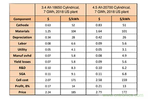 Tesla公開說明選擇20700的優(yōu)勢:“If the new meets the same life and safety requirements, once it is produced at the same yields and at high volume, it will offer about 3-4 % increase in energy density and a 7 % reduction in cost”,即在達到與18650同樣的良率和產(chǎn)能后,能帶來能量密度增加和成本下降兩個優(yōu)勢,這從下表中也能得到充分體現(xiàn)。