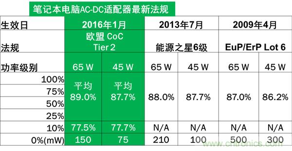如于2016年1月1日生效的歐盟CoC V5 Tier 2 規(guī)定,輸出功率為45 W和65 W的AC-DC適配器平均能效需分別達(dá)到87.7%和89%,待機功耗分別低于75 mW和150 mW,并且還要求10%負(fù)載條件時的能效需分別達(dá)到77.7%和77.5%。電源設(shè)計工程師面臨體積、能效和成本等多方面的設(shè)計挑戰(zhàn)。
