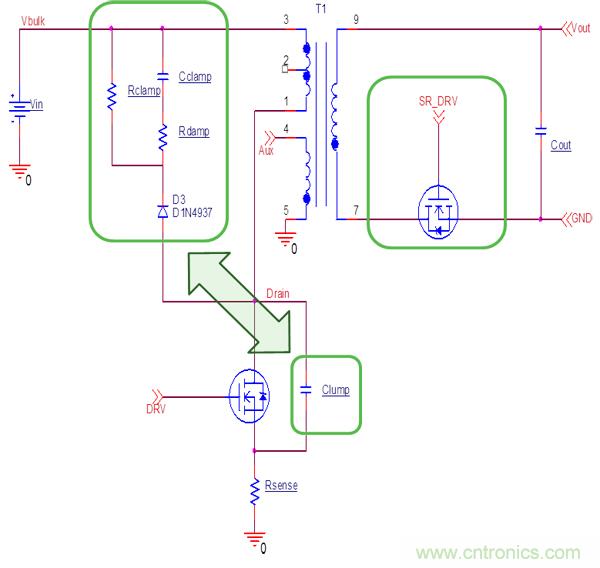 準(zhǔn)諧振模式允許使用相對大的緩沖電容Clump,額外增加的Clump (10-22pF)可以減少MOS管關(guān)斷損耗,減少電磁干擾(EMI)。準(zhǔn)諧振反激有利于次極端加SR,可降低整流二極管導(dǎo)通損耗,減少次極端整流管尖峰電壓,降低其耐壓要求。