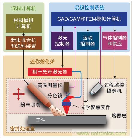 混料系統包含幾種不同的熔覆粉末以及配備了材料模擬軟件的計算機。迷你熔化爐包括光纖激光器和密封處理室,而后者包含光學聚焦元件、送粉噴嘴、運動系統、高溫測量儀及過程監控攝像機。沉積控制系統配置了運行著CAD/CAM軟件和有限元方法(FEM)模擬軟件的計算機。