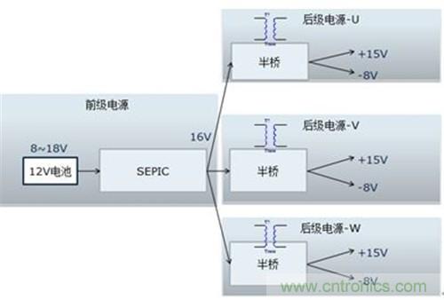 該電源的輸入是新能源乘用車常規的12V電源,該電源通常波動范圍是8~16V,而驅動電源的輸出需要相對穩定。需要設計多組寬壓輸入、定壓輸出的隔離電源。本設計把電源分成兩級:前級電源實現寬壓輸入、定壓輸出功能,后級實現隔離功能,結構見圖1。