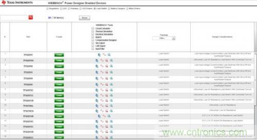 開始設計前,請點擊TI WEBENCH設計中心的Power Designer Enabled Devices鏈接。從頂部列表中選擇“Load Switch”(負載開關)選項(參見圖 1)。單擊“Create”(創建)按鈕,WEBENCH工具將打開所選擇的負載開關的產品頁面。