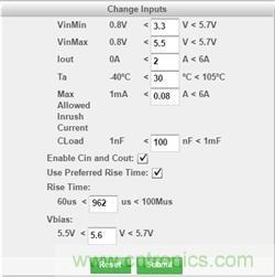 這是WEBENCH設計器工具中最有用的一個控制臺,因為它會告訴你特定應用時負載開關預計運行情況。浪涌電流、上升時間、效率、導通電阻和功率耗散只是眾多計算結果的一部分。若要改變這些數值,只需在“Change Inputs”控制臺中輸入新的設計參數即可。這樣做可以看到更改設計參數會如何改變負載開關的行為。例如,更改輸出電容會影響負載開關的浪涌電流。